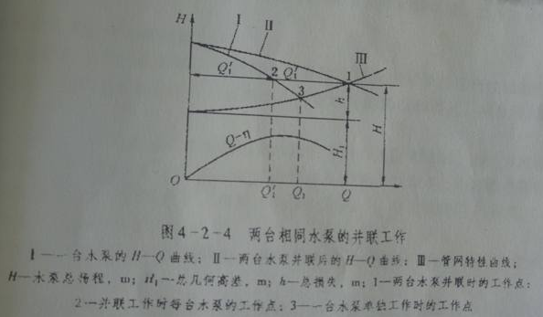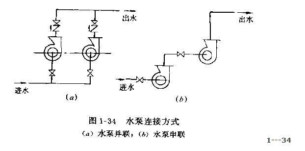 当第一台多级离心泵的出水管连接在第二台多级离心泵的吸人管时称为两台水泵串联见图1--34(b);当第一台水泵与第二台多级泵的吸入管连接在一起,出水管也连接在一起时称为多级泵的并联见图1--34(a)。